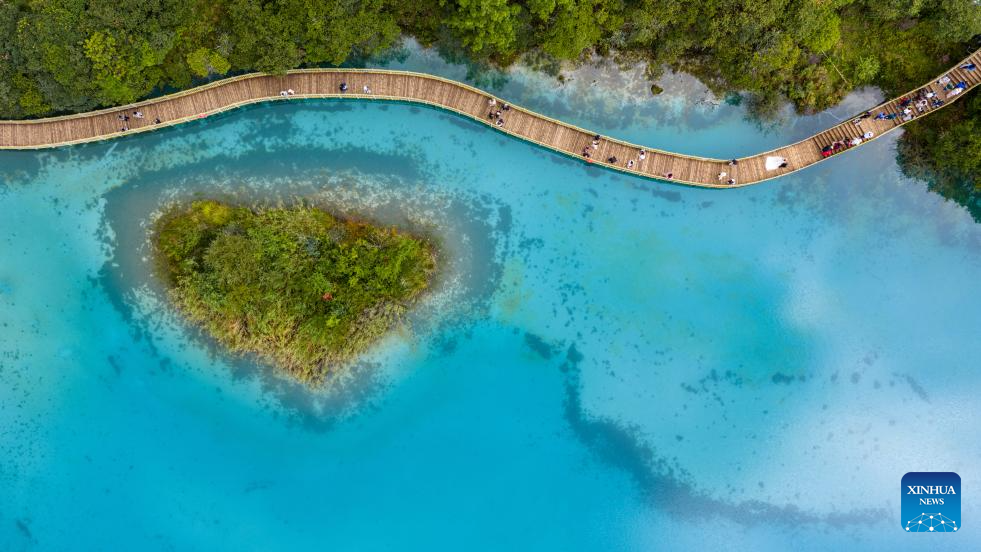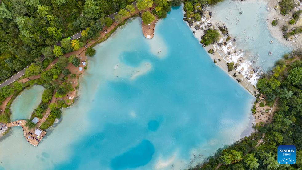 An aerial drone photo taken on Sept. 8, 2025 shows tourists visiting the Lanyue (Blue Moon) Valley in Lijiang City, southwest China's Yunnan Province. (Xinhua/Hu Chao)