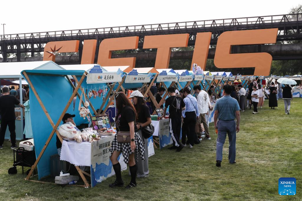 People view products at the booth of Beijing Chaoyang Disctrict at the 2025 China International Fair for Trade in Services (CIFTIS) in Beijing, capital of China, Sept. 12, 2025. The 2025 CIFTIS is held from Sept. 10 to 14 at the Shougang Park in Beijing. This year's fair features a wide range of cultural and creative products, which are highly popular among visitors. (Xinhua/Sui Shangjun)