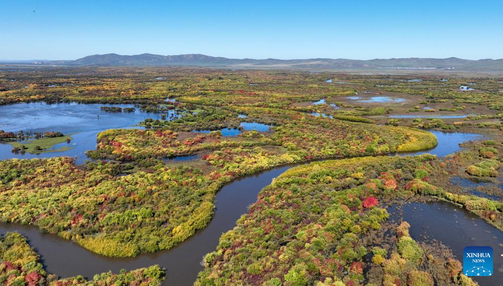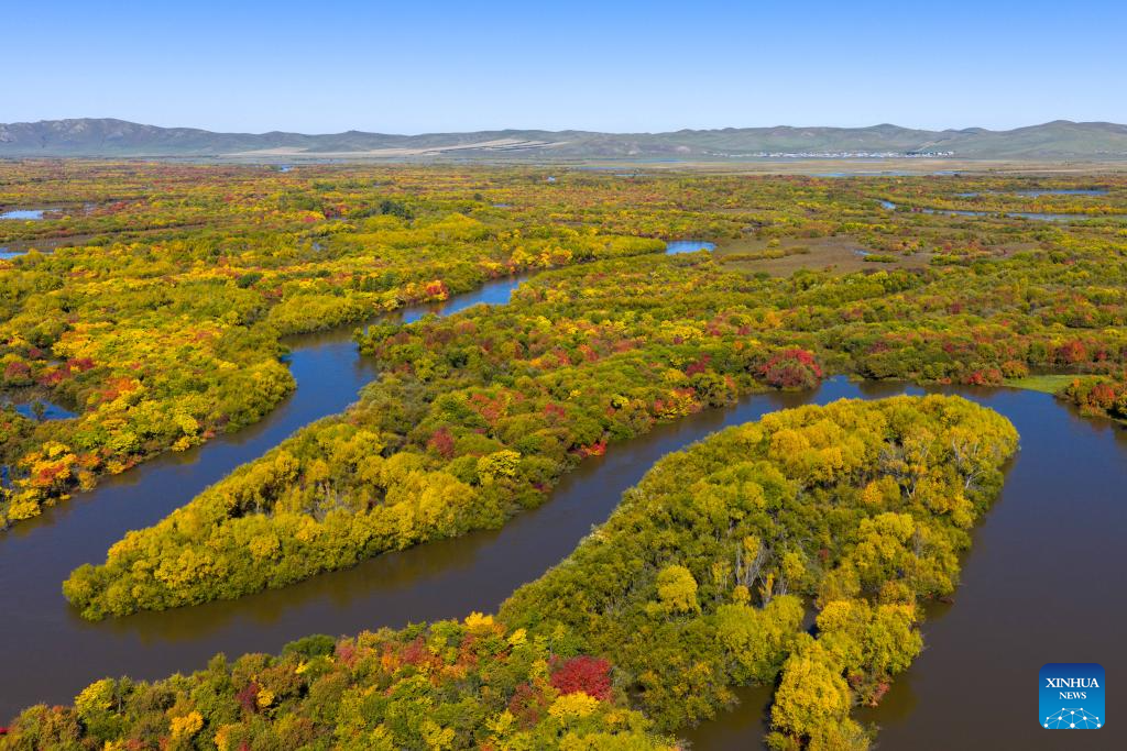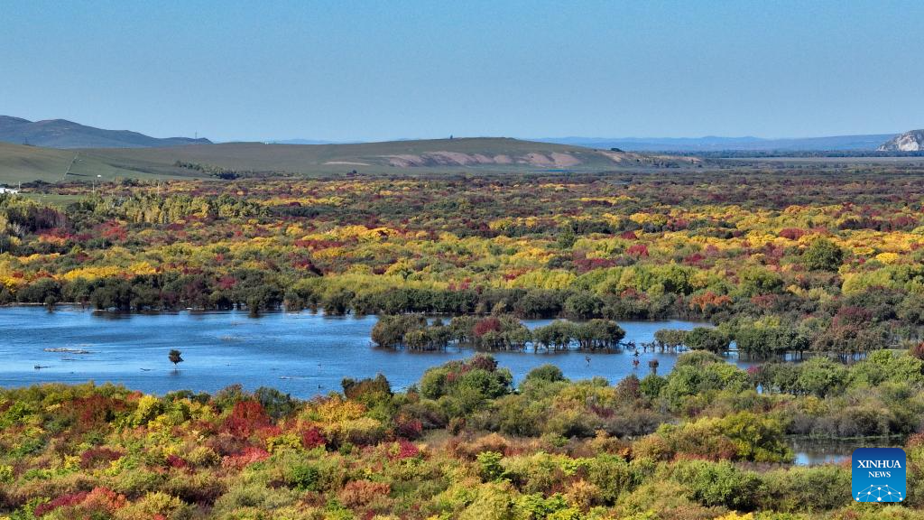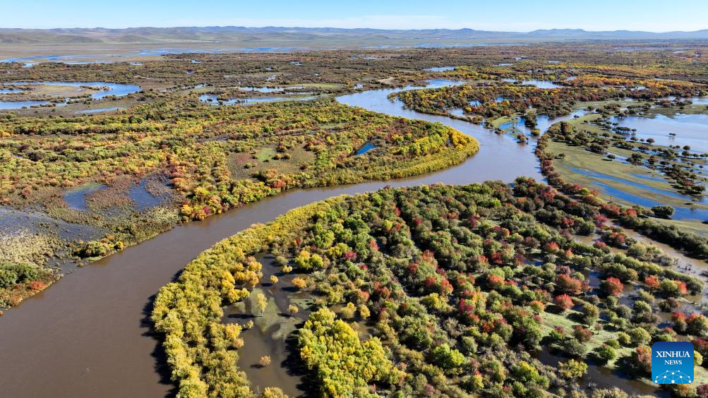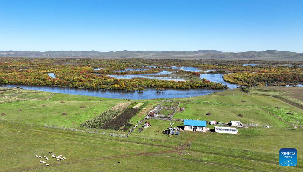 An aerial drone photo taken on Sept. 15, 2025 shows a view of the wetland around the Ergune River in Hulun Buir, north China's Inner Mongolia Autonomous Region. (Xinhua/Ma Jinrui)