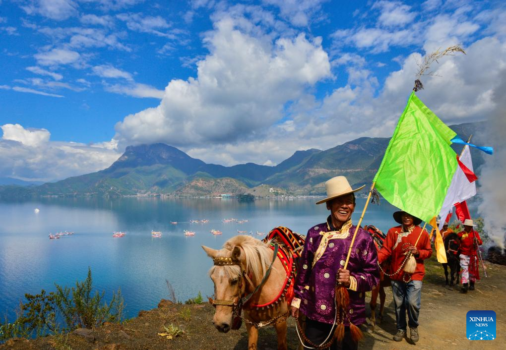 Local people herd horses while circling the mountain in Yanyuan County of Liangshan Yi Autonomous Prefecture, southwest China's Sichuan Province, Sept. 16, 2025. The first mountain and lake circling festival of Lugu Lake kicked off at Liangshan Yi Autonomous Prefecture on Tuesday. Mountain and lake circling is an important folk custom of the Mosuo people living near Lugu Lake. Starting this year, Liangshan Prefecture has officially designated the 25th day of the seventh lunar month as the mountain and lake circling festival, making it a local statutory holiday. Residents of Yanyuan and Muli counties can enjoy a one-day exclusive holiday. (Photo by Zeng Chengxu/Xinhua)